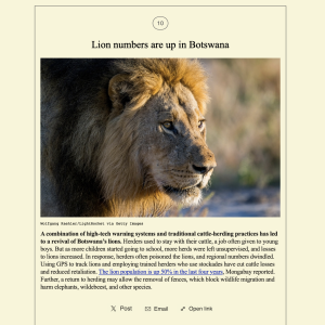 Pandas are not the only species turning the corner. Lions are also enjoying a moment in Botswana. Earlier in the month, I clipped this story about the lion population in Botswana. A combination of high-tech warning systems and traditional cattle-herding practices has led to a revival of Botswana’s lion population.